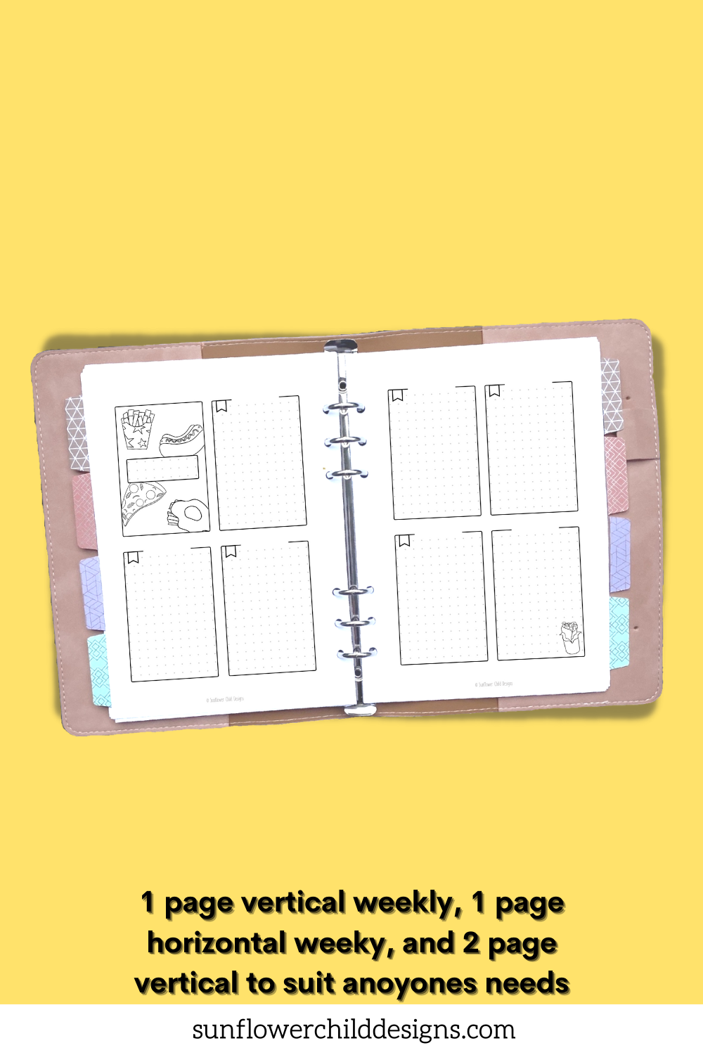 It’s time to ditch the boring journals and planners collecting dust. This Comfort Foods Themed bullet journal setup provides pages designed for YOU. While task lists are important this setup also includes pages to focus on your goals, self care, favorite memories for the month and so much more. These decorative pages awaken your inner child and help you let loose while simultaneously gets your adult life together. You’ll be inspired to get organized, focused, and creative!