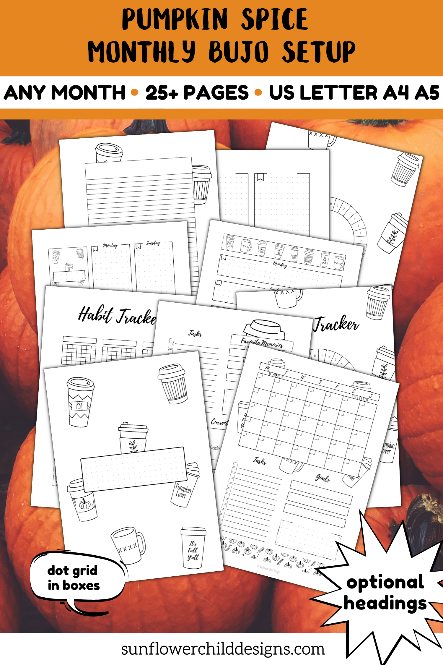 Pumpkin Spice Latte Fall Monthly Bullet Journal Setup - Any Month - undated - headings optional - dot grid